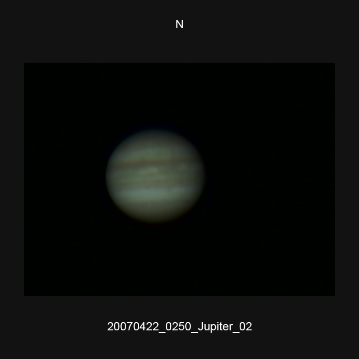 20070422_0250_Jupiter_02.JPG -   Newton d 309,5 / af 5730 (Barlow) Phillips 740K UV-IR-Cut filter 640x480 AVI-750 (15 frames/s) Giotto, A-PS-CS3