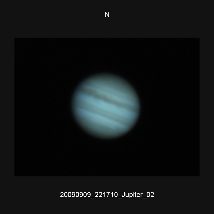 | 4 | 20090909_221710_Jupiter | Newton d 309,5 / af 5780 (Barlow) TIS DBK 21AU04.AS UV-IR-Cut filter 640x480 AVI-1500 (30 frames/s) IC Capture.AS, AviStack, A-PS-CS | 20090909_221710_Jupiter_02.JPG |