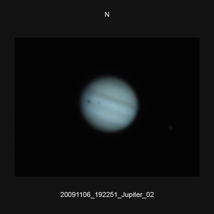 | 1 | 20091106_192251_Jupiter | Newton d 309,5 / af 5780 (Barlow) TIS DBK 21AU04.AS UV-IR-Cut filter 640x480 AVI-1620 (30 frames/s) IC Capture.AS, AviStack, A-PS-CS Bad Seeing Conditions | 20091106_192251_Jupiter_02.JPG |