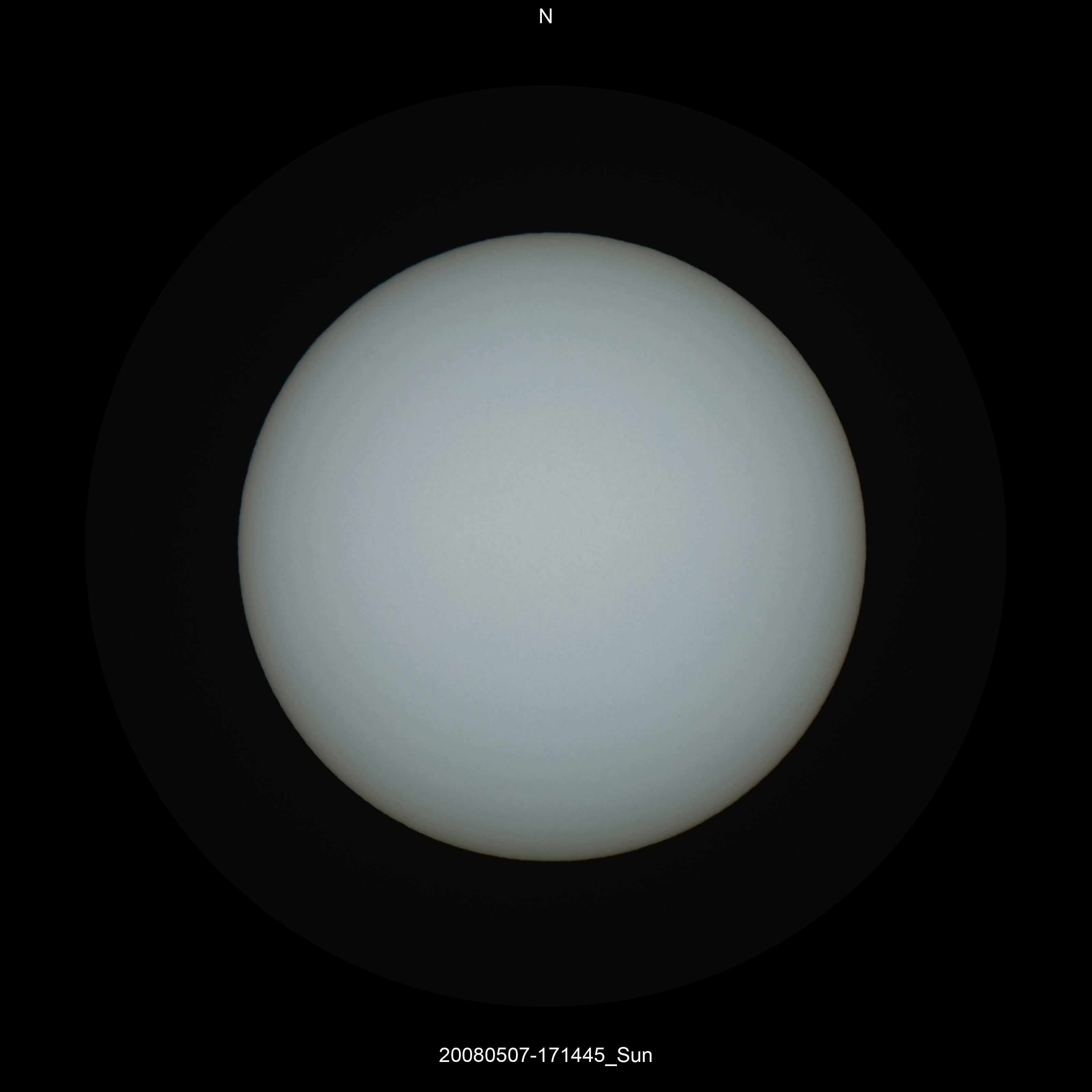 | 8 | 20080507-171445_Sun | Newton d 303,15 / af 1623 & Coma Corrector CANON-EOS5D (AFC-Filter) 50 ASA Baader Tape-3.8 Filter 1 light-frame 1/6400s Canon-RAW-Image, Adobe-PS-CS3 | 20080507-171445_Sun_02.jpg |
